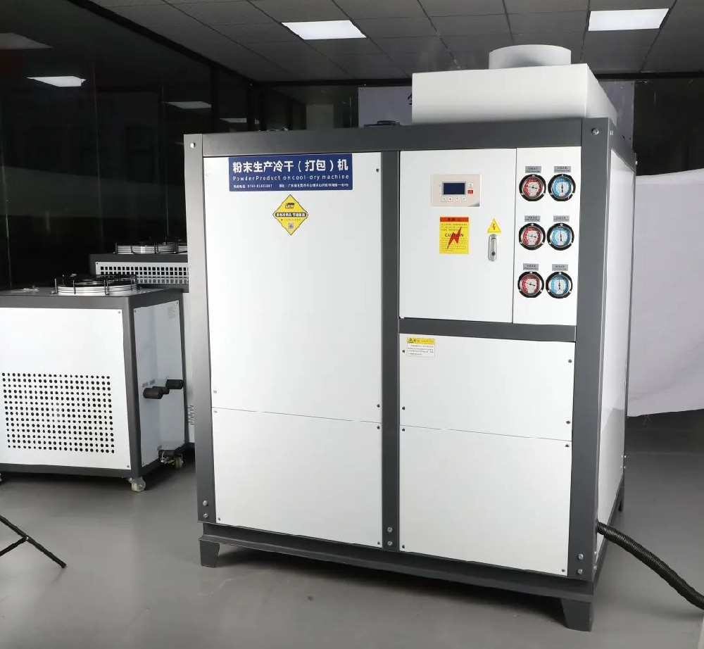 樂暢研發(fā)的這款粉末冷干機(jī)主要是針對粉末廠。因?yàn)榉勰┰诖虬^程中會產(chǎn)生結(jié)團(tuán)的現(xiàn)象,需要冷風(fēng)機(jī)吹冷風(fēng)來解決結(jié)團(tuán),提升打包效率。它的制冷原理是通過吸干凈的自然風(fēng)進(jìn)入機(jī)器內(nèi)容,通過壓縮機(jī)制冷,將冷風(fēng)機(jī)吹到客戶所需的環(huán)節(jié)上。